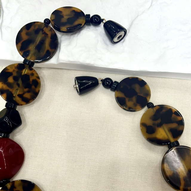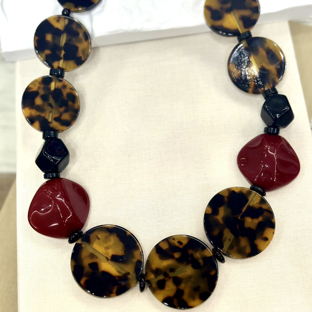 Audacieux et raffiné, le collier Amela séduit par son jeu de formes et de couleurs. Ses larges pastilles en résine effet écaille s’alternent avec des perles noires et deux pierres rouges au style sculptural, apportant une touche moderne et affirmée.